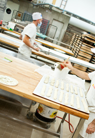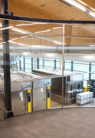 Die Teigsorten für unsere Semmeln und Brote portionieren, kneten, rollen und in Backformen füllen – das handwerkliche Knowhow unserer Mitarbeiter zeigt sich für alle Besucher sichtbar im Zentrum unserer Produktionsstätte. Hier stehen die großen Arbeitstische. Und wie eh und je in der Tradition des Bäckereihandwerks sind diese Tische auch bei uns das Herzstück echter, handwerklicher Herstellung. Wir haben sie aus starkem, soliden Buchenvollholz schreinern lassen. Hochwertige Qualitätsarbeit braucht beste Bedingungen. Und großzügig Platz, sich zu entfalten.