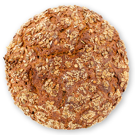 – 80 % Roggenmehl 1150 – 20 % Weizenmehl 550 – Roggensauerteig – Sesam, Kürbiskerne, Sonnenblumenkerne, Koriander, Fenchel, Anis, Kümmel, Salz, Hefe, Malz, Wasser