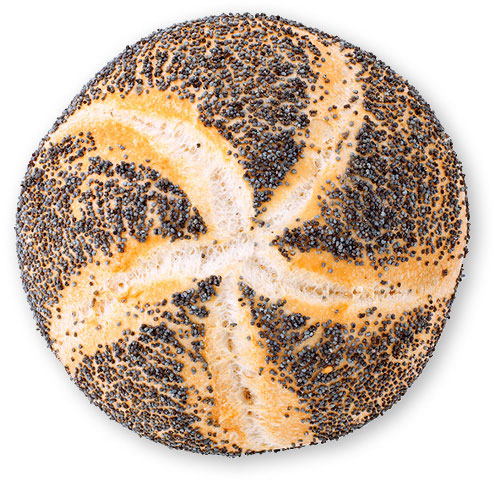 – 100 % Weizenmehl 550 – Weizen-Aromavorteig – Mohn – pflanzliche Margarine, Malzbackmittel – Salz, Hefe, Wasser